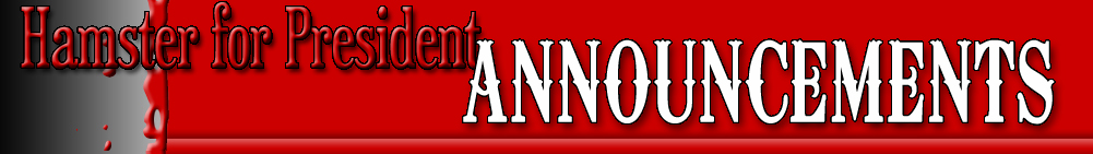 You may contact the Hamster For President campaign at: Don't miss the latest about the Hamster For President campaign! You can receive automatic e-mail notices when news is posted here. Just enter your email address below.